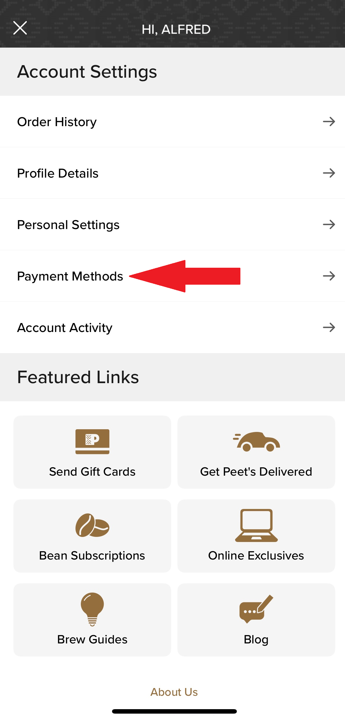 To update your payment method, from the Home Screen tap "Account" from the bottom menu on the home screen. Tap “Payment Methods” to update, add, remove, or select your default payment method. You can also update your payment method during Checkout.