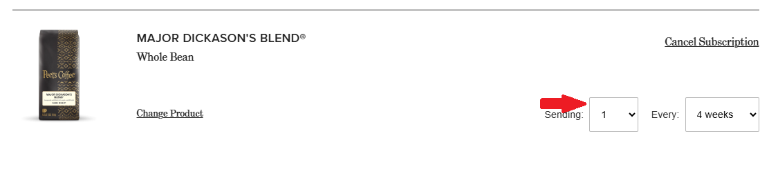 - Select your preferred quantity from the dropdown menu next to 'Sending'. You can also adjust your subscription frequency from here next to the 'Every' label.