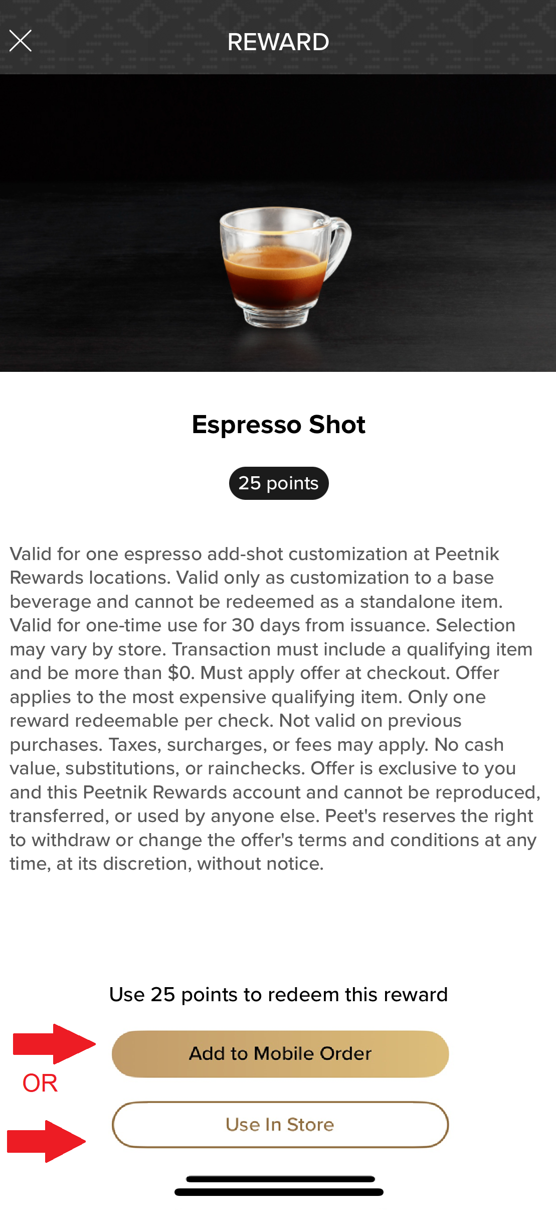 - To learn more about the reward, tap into the details page. From there you can convert your points into your selected reward and choose to apply it to your in-store or mobile order.