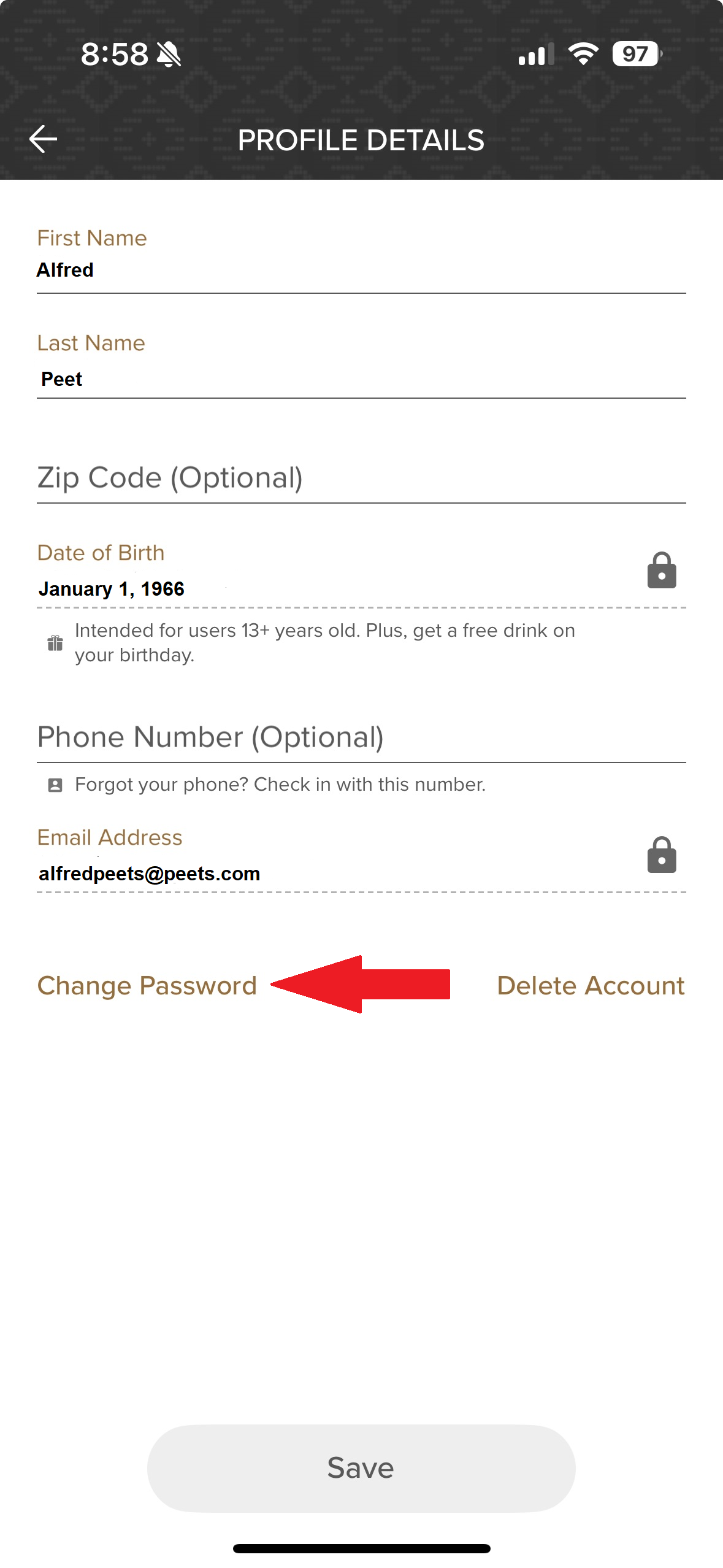 -Enter the current password, new password and lastly tap 'Change Password'